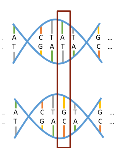 Figure 1: This image depicts segments of two copies of a person’s chromosome, representing one received from each parent. The outlined section represents a SNV, showing a single position along the strands where different alleles (A/T vs. G/C) were received from the two parents. Image sourced from Prof. Grinde’s STAT 494 class notes.